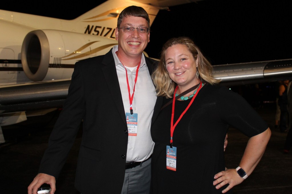 After posing in front of the jet, Tim and Meg Dermody of Gorham talked about Camp Sunshine, where they spent a week in June 2013 with their son Finnian, who was diagnosed with brain cancer as a kindergartener, and his younger sister Shayla.