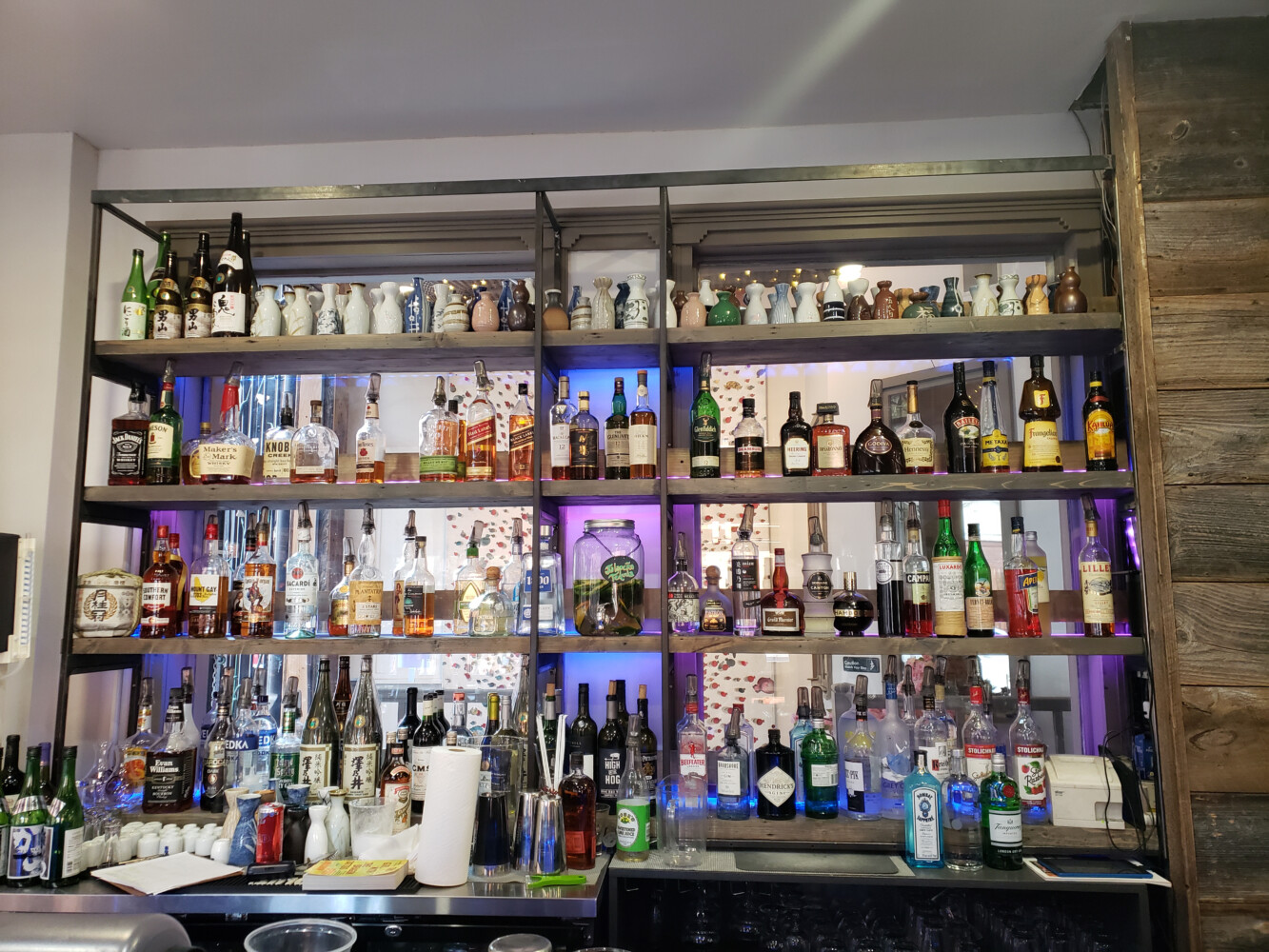 The bar upstairs at N to Tail has a full shelf of tokkuri, the serving vessel for sake. Photos by Angie Bryan