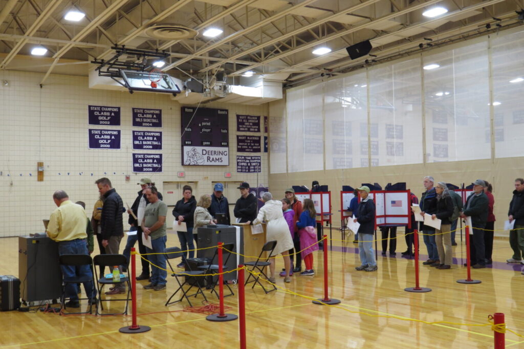 Voters wait to cast their ballots at Deering High School Tuesday evening. Election Warden Barbara Harvey said the election went smoothly, even when the gymnasium had to be evacuated and ballots secured due to a fire alarm triggered by burning popcorn from the nearby school cafeteria. Michael Kelley / The Forecaster