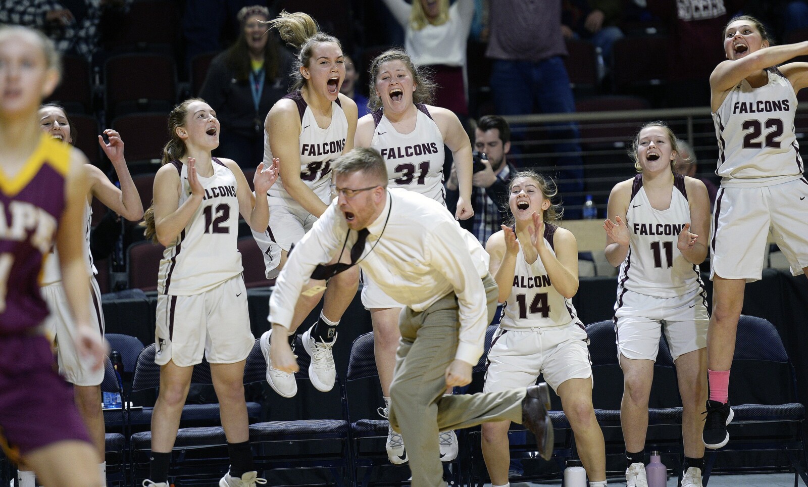The Freeport bench, along with Coach Seth Farrington, erupts during an overtime win over Cape Elizabeth in the Class B South semifinals last winter. The Falcons should contend for the regional title again this season. Shawn Patrick Ouellette/Staff Photographer