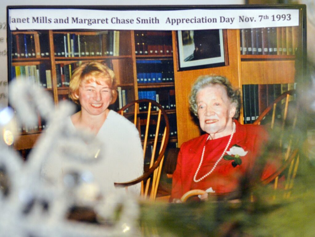 The Blaine House display about former U.S. Sen. Margaret Chase Smith features current Gov. Janet Mills posing with her in a 1993 photo. This year’s decorations featured items borrowed from the Maine State Museum and other museums in displays about famous Maine women. Kennebec Journal photo by Joe Phelan Buy this Photo