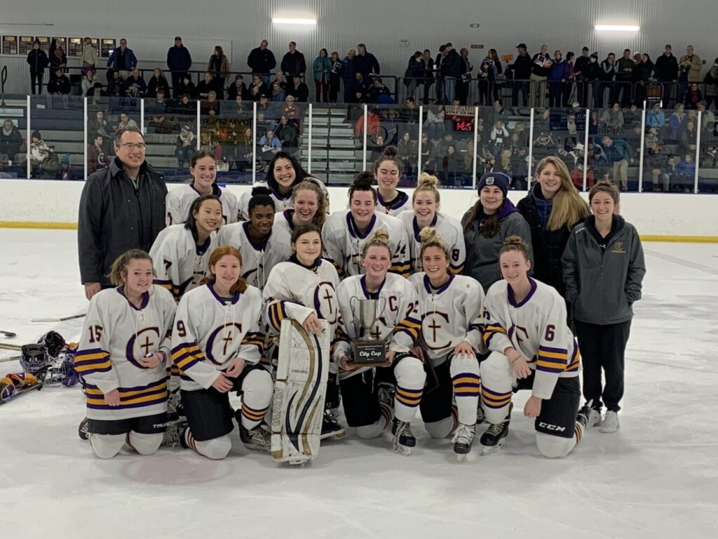 Cheverus girls’ hockey team celebrates after winning the “City Cup” over rival Portland/Deering Saturday. Contributed photo.