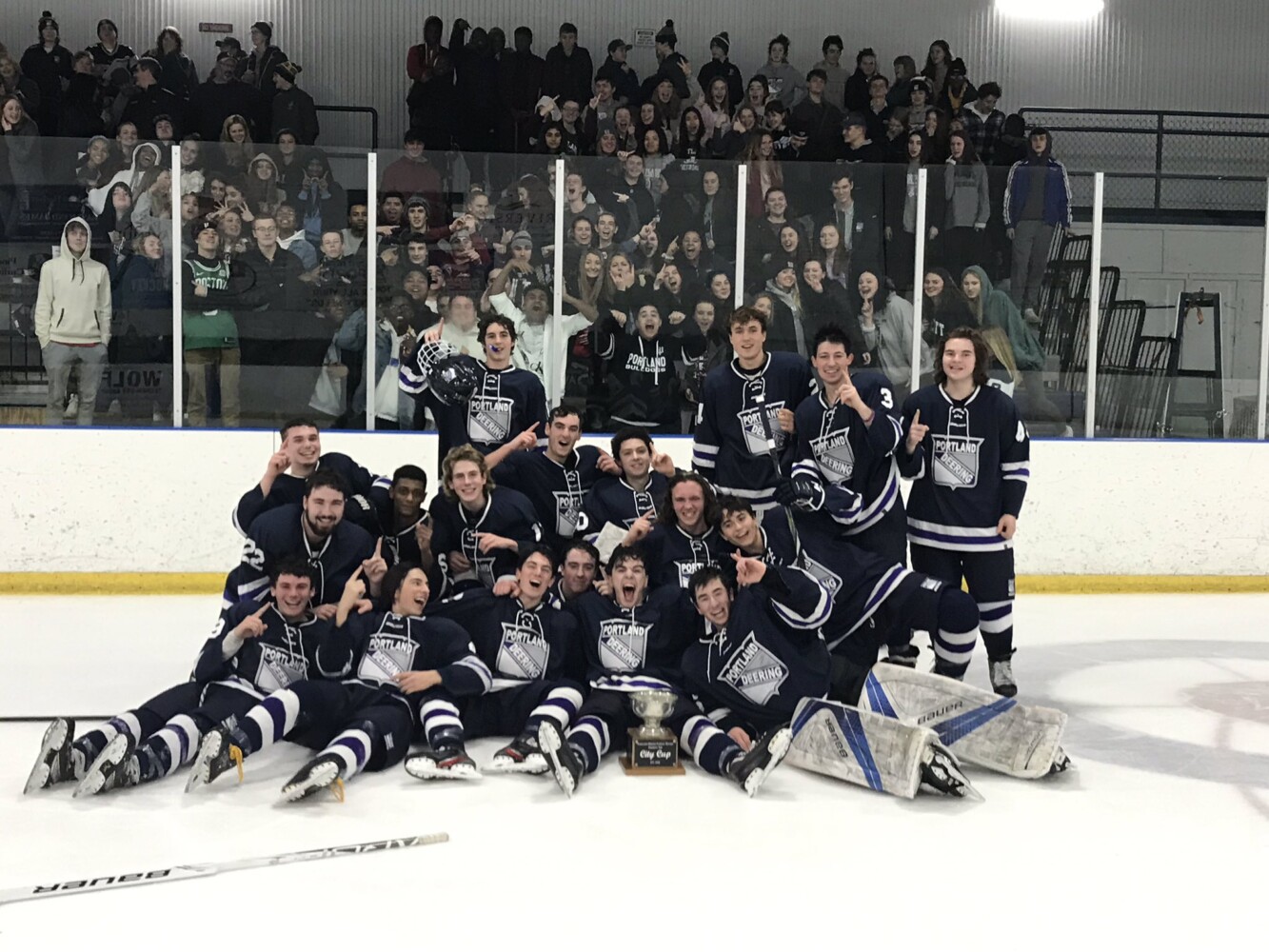 The Portland/Deering boys’ hockey team is all smiles after knocking off previously undefeated Cheverus in Saturday’s “City Cup.” Contributed photo.