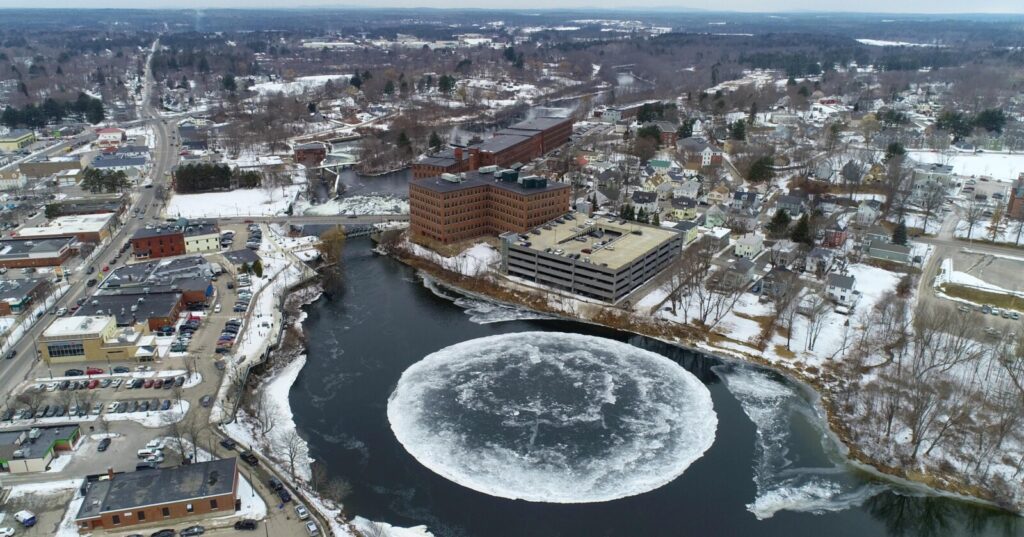 WESTBROOK— A year ago, Westbrook made global headlines when a large, rotating ice disk appeared on the Presumpscot River. This year, the ice disk is still spinning in the minds of locals, especially business owners, who are wondering if it will return.