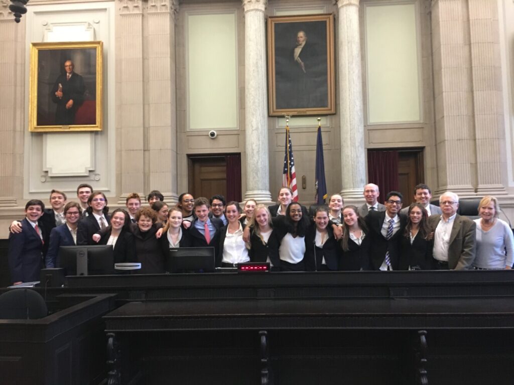 Cape Elizabeth High School’s mock trial team in the court room after winning state finals against Brewer in Portland. The team is excited to head to nationals in May, said coach Richard O’Meara. Courtesy Mary Page