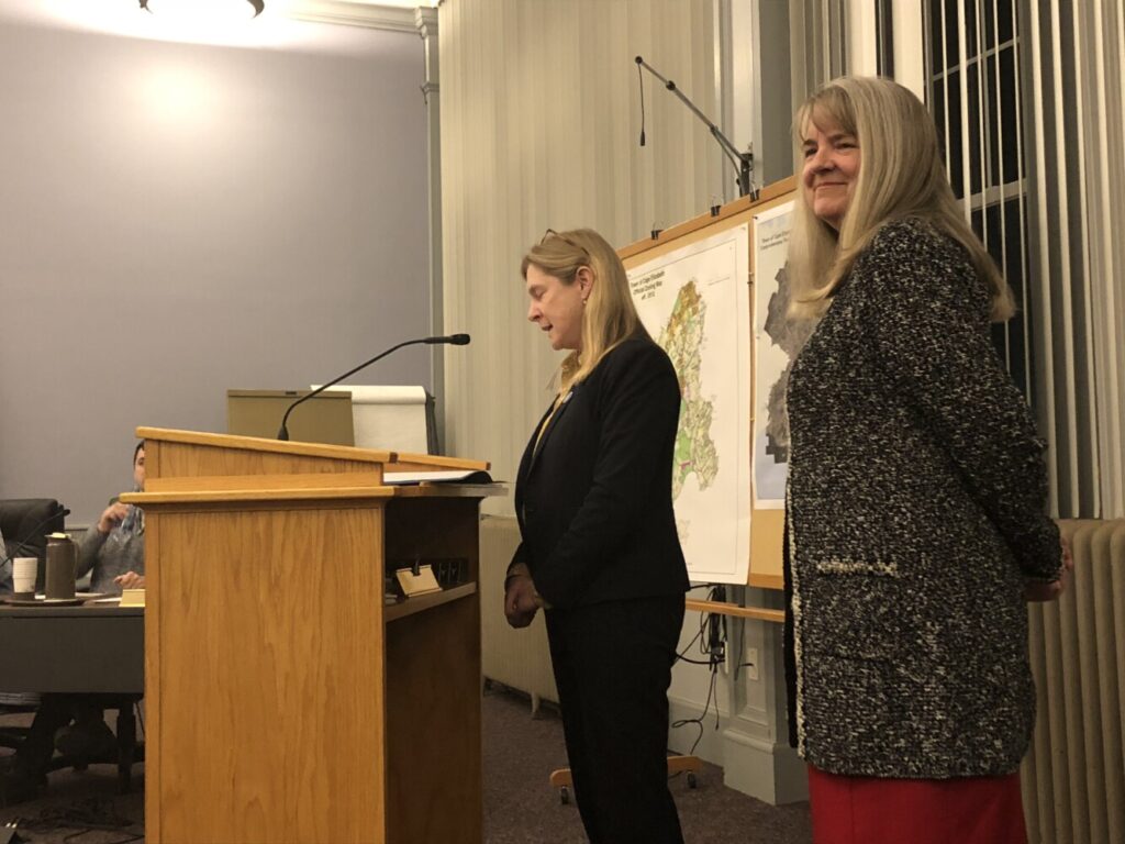 State Rep. Anne Carney (left) reads a legislative sentiment to the Cape Elizabeth High School mock trial team that she and State Sen. Rebecca Millett presented on the Jan. 14 school board meeting. Catherine Bart/Sentry