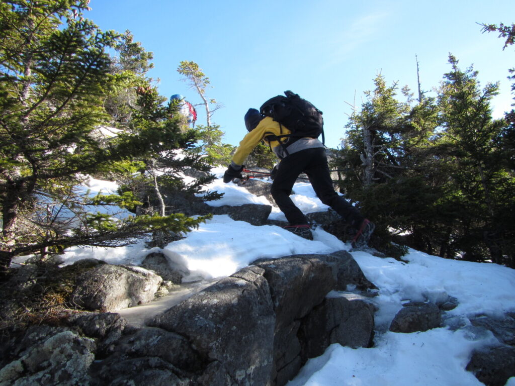 Entering a sheltered wooded section, we navigated through immense boulders with lengthy stretches of hard ice. At 2.6 miles, a junction for Woodsum Spur was encountered on an elongated sloping ledge. Signage indicated the partially visible rugged summit was another six-tenths of a mile. After scrambling over several complex rocky inclines, we negotiated up a consequential icy slide.