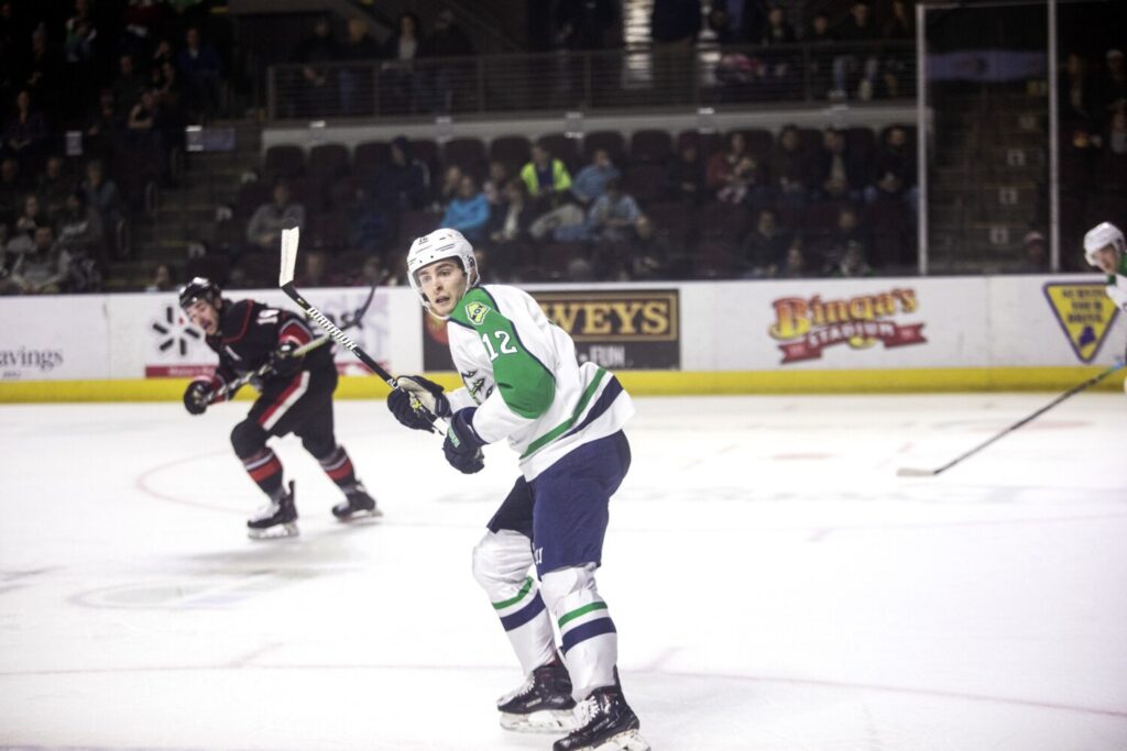 Ted Hart didn’t factor into the scoring Sunday in a 3-2 loss to the Brampton Beast at Cross Insurance Arena, but he needs just one more goal to reach double figures in his first season with the Maine Mariners. Brianna Soukup/Staff Photographer Buy this Photo
