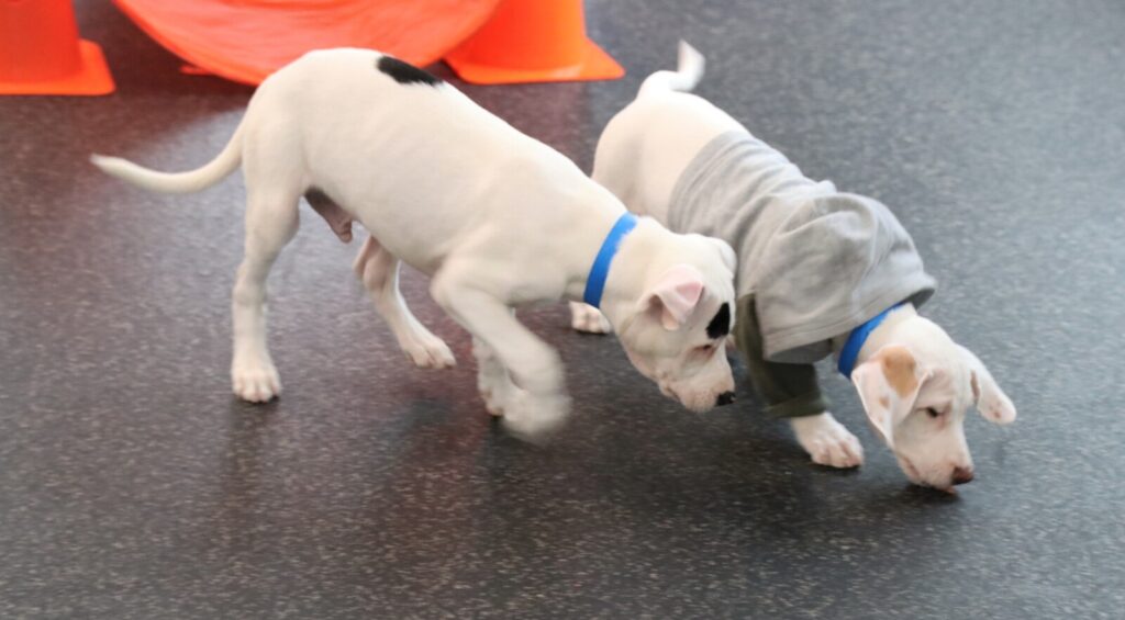 They romped and ran and navigated the Animal Welfare Society training room with curiosity and delight.