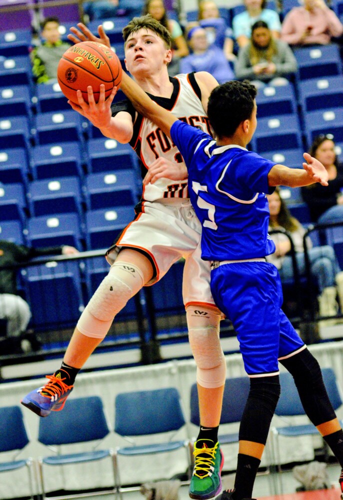 Parker Desjardins of Forest Hills goes up for a shot against Seacoast Christian’s Seth Vega during a Class D South quarterfinal at the Augusta Civic Center. Desjardins scored 26 points in an 86-29 victory. Joe Phelan/Kennebec Journal Buy this Photo