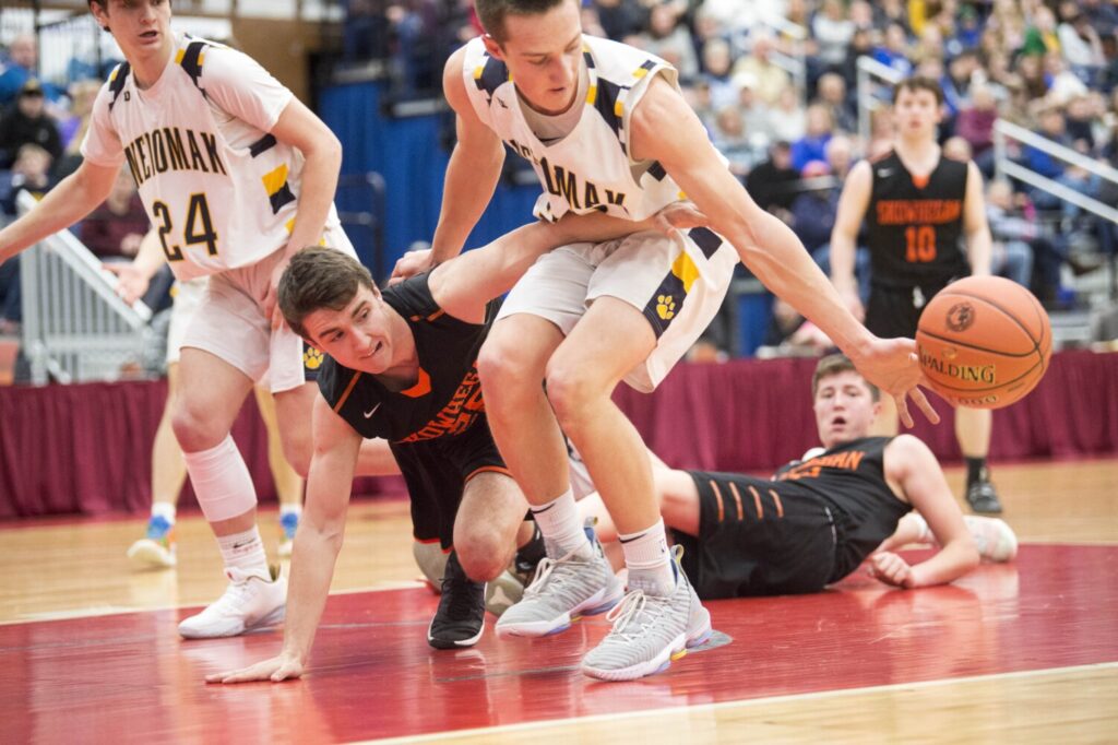 Medomak Valley’s Gabe Allaire, center, and Skowhegan’s Chase Carey reach for a loose ball during a Class A North quarterfinal Saturday at the Augusta Civic Center. Medomak Valley won in overtime, 50-46. Michael G. Seamans/Morning Sentinel