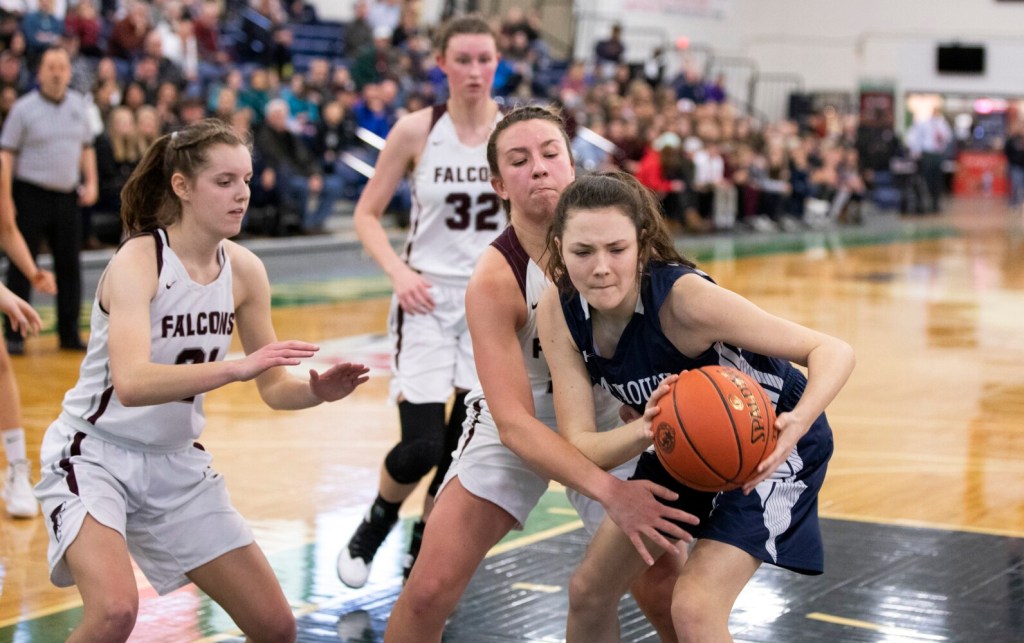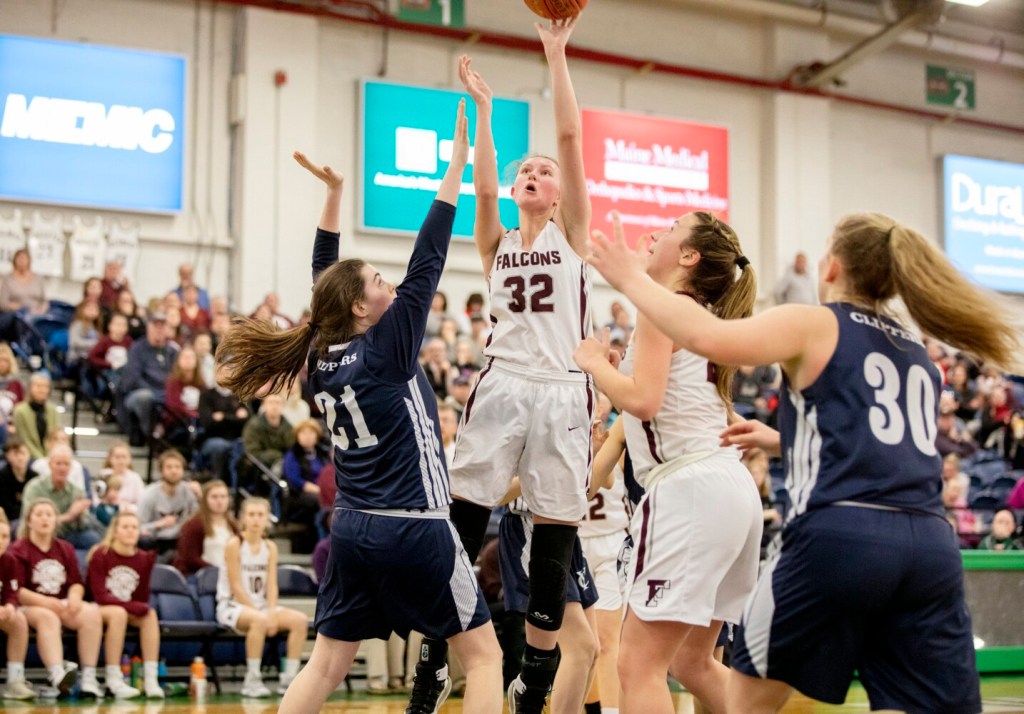 With 24.8 seconds to go in the half, Gould took a pass from senior Lindsay Routhier and made a layup to snap a 7-minute, 6-second drought, but the Falcons still were down four, 19-15, at the break.
