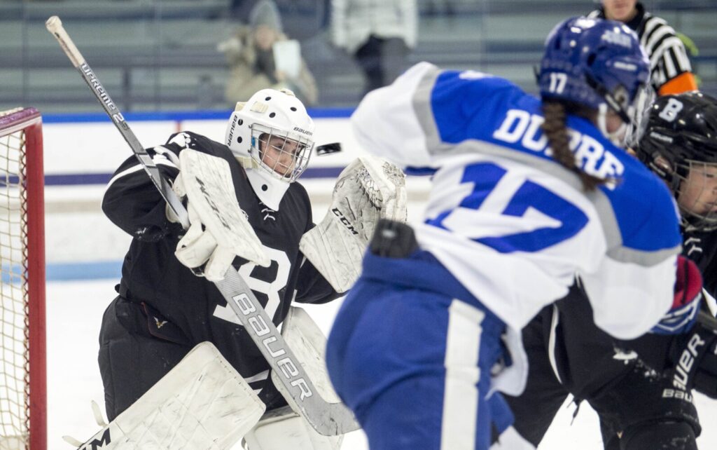 Bowdoin College goalie Dani Marquez (1) keeps her eye on the puck as it quickly approaches her face as Colby College’s Tess Dupre (17) battles for the rebound in the first period in a NESCAC quarterfinals game at Alfond Arena at Colby College in Waterville on Saturday. (Michael G. Seamans / Morning Sentinel)