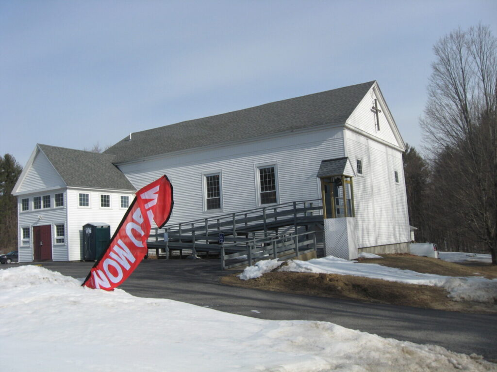 A banner says Buxton United Methodist Church is “now open.” Robert Lowell / American Journal