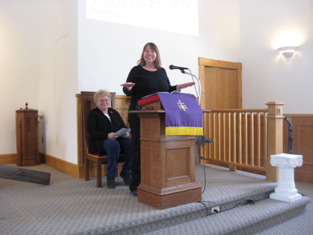 The Rev. Lynn Briggs, pastor of Buxton United Methodist Church, on Sunday leads the first worship service at the church since a methamphetamine lab was found there. Behind her is longtime church member Lynn Gonyea. Robert Lowell / American Journal