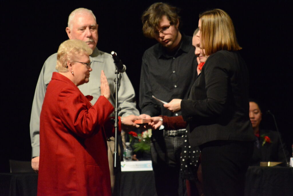 Mary Hall is inaugurated as the Ward 4 School Committee member in November. Beside her is her husband John Hall, grandchildren Chris and Chiara Hall, and City Clerk Angela Holmes. Hall was soon after nominated vice chairman of the School Committee and chairman of its Finance Committee. File photo