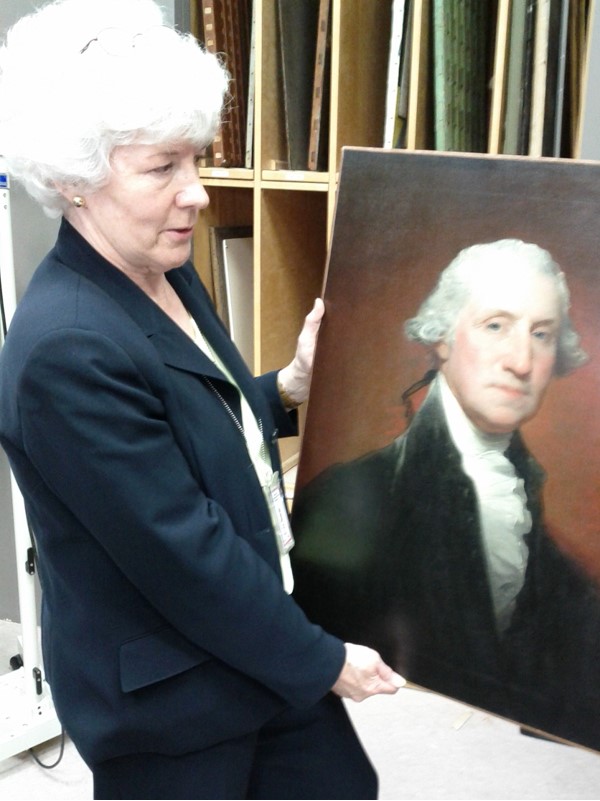Sarah Fisher holds Gilbert Stuart’s portrait of George Washington to a visitor in the Painting Conservation Department of the National Gallery of Art at Washington, D.C., Sarah Fisher