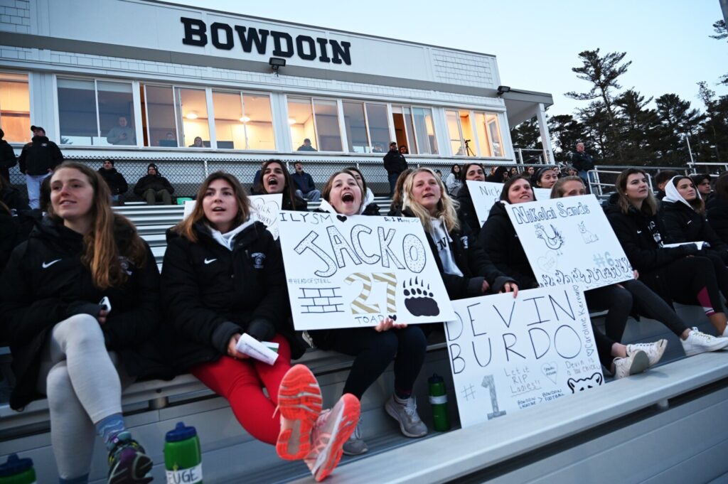 Bowdoin fans – sophomore Emily Fuller, left, freshman Eugenie Rovegno, junior Eliza Denious and senior Caroline Maxwell – cheer on the men’s lacrosse team Wednesday night at Brunswick in what may be the team’s last game of the season. The school canceled the spring season earlier in the day due to the coronavirus outbreak. Shawn Patrick Ouellette/Staff Photographer Buy this Photo