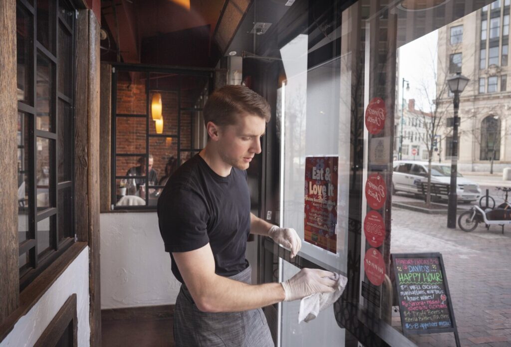 Tyler Crowell, a waiter at David’s Restaurant in Portland, sanitizes the entryway doors at the restaurant after the lunch shift on Wednesday. Gregory Rec/Staff Photographer