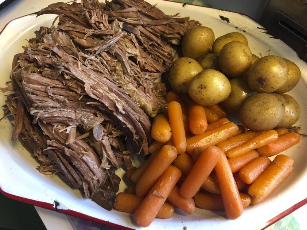 Pre-coronavirus, Kim Bierly often worked late at the office and would meet her husband for a quick dinner out. Now, working from home, she’s pulling out old recipes the kinds of things she remembers her mother making — like this slow cooker pot roast with carrots and potatoes. Photo by Kim Bierly via AP