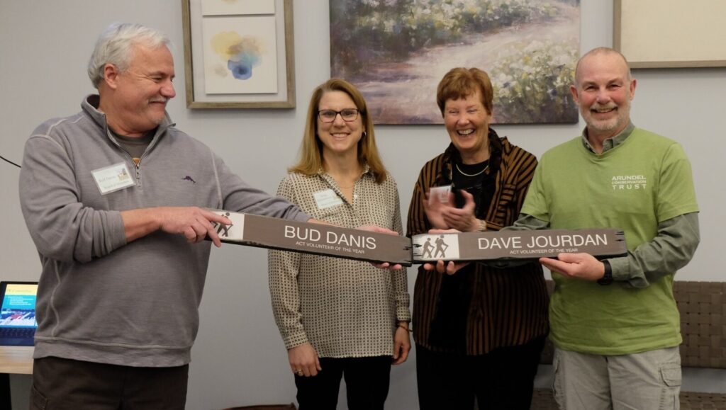 Bud Danis and Dave Jourdan are awarded Arundel Conservation Trust’s 2020 Volunteer of the Year Award by Tanja Schoenbrod, ACT trailmaster, and Joan Hull, ACT president. From left, Bud Danis, Tanja Schoenbrod, Joan Hull and Dave Jourdan. Courtesy photo