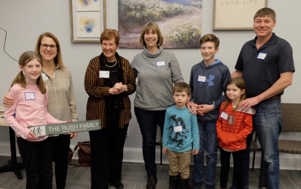 The Rush family receives the Arundel Conservation Trust’s special 2020 Volunteers of the Year Award presented by Tanja Schoenbrod, ACT trailmaster and Joan Hull ACT president. From left, Molly Rush(10), Tanja Schoenbrod, Joan Hull, Catherine Rush, Little Big Sam (4), David Rush (13), Lila Rush (7) and Sam Rush. Courtesy photo