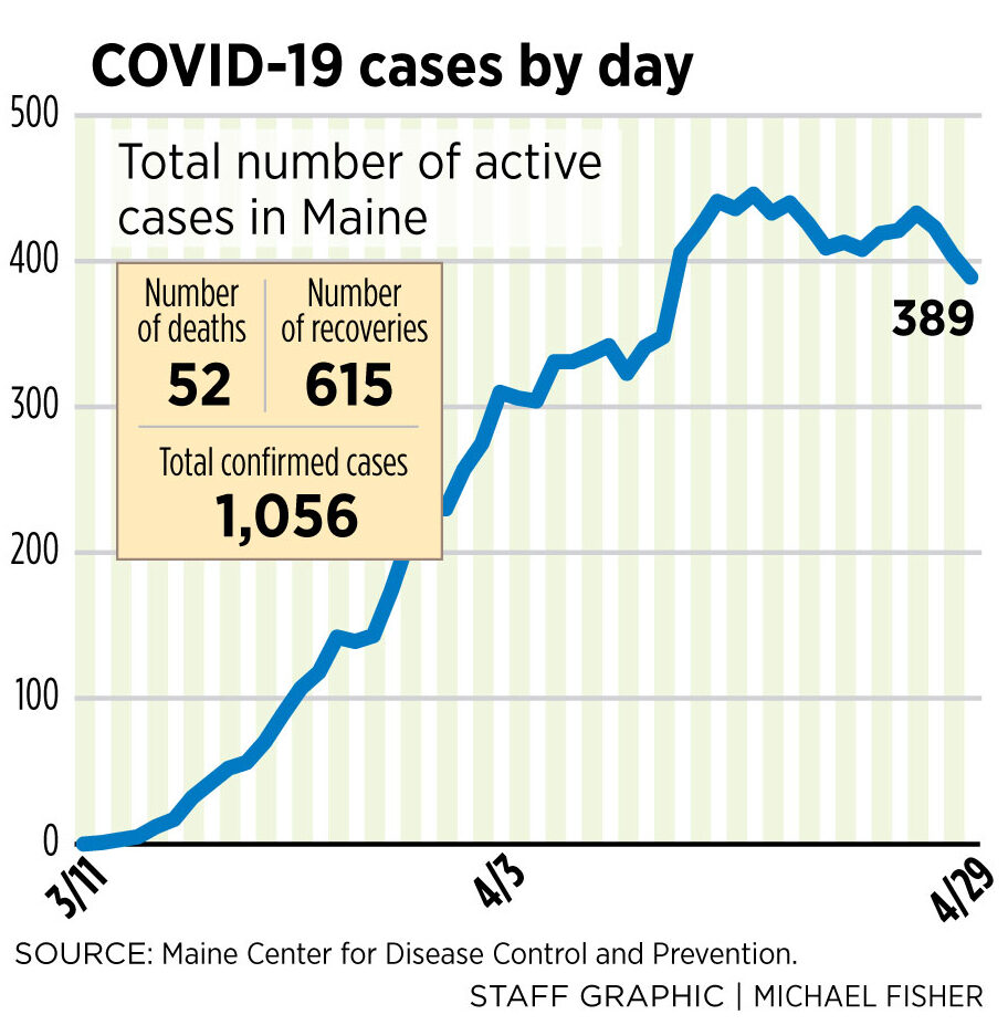 The number of active COVID-19 cases – calculated by deducting the 52 deaths and 615 recovered individuals from total cases to date – fell below 400 on Wednesday for the first time since April 12. Maine CDC reported 389 active cases as of early Wednesday morning. That’s a decline from the peak of 446 active cases on April 17.