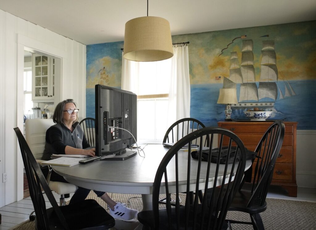 Kate Everett, director of operations for SMRT, works from her home office in Kennebunk, using a good office chair and large computer monitor. Everett also positioned the monitor to take advantage of window light for video conferences she joins. Gregory Rec/Staff Photographer