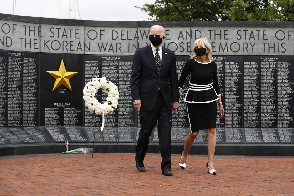 Biden and his wife, Jill, laid a wreath of white flowers tied with a white bow, and bowed their heads in silence at the park. He saluted. “Never forget the sacrifices that these men and women made,” he said after. “Never, ever, forget.”