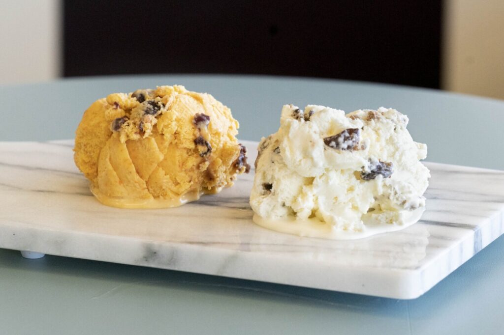 Carrot Pudding ice cream, left, and Independence Cake ice cream are among the new vintage flavors Lauren Guptill has developed for Rococo based on recipes from the cookbooks collection at Bowdoin College. Gregory Rec/Staff Photographer