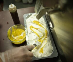 Guptill swirls orange zest mixed with orange blossom water into Brahma Ice Cream, a new vintage flavor she developed from a recipe in the 1854 “Cook and Confectioner.” Gregory Rec/Staff Photographer