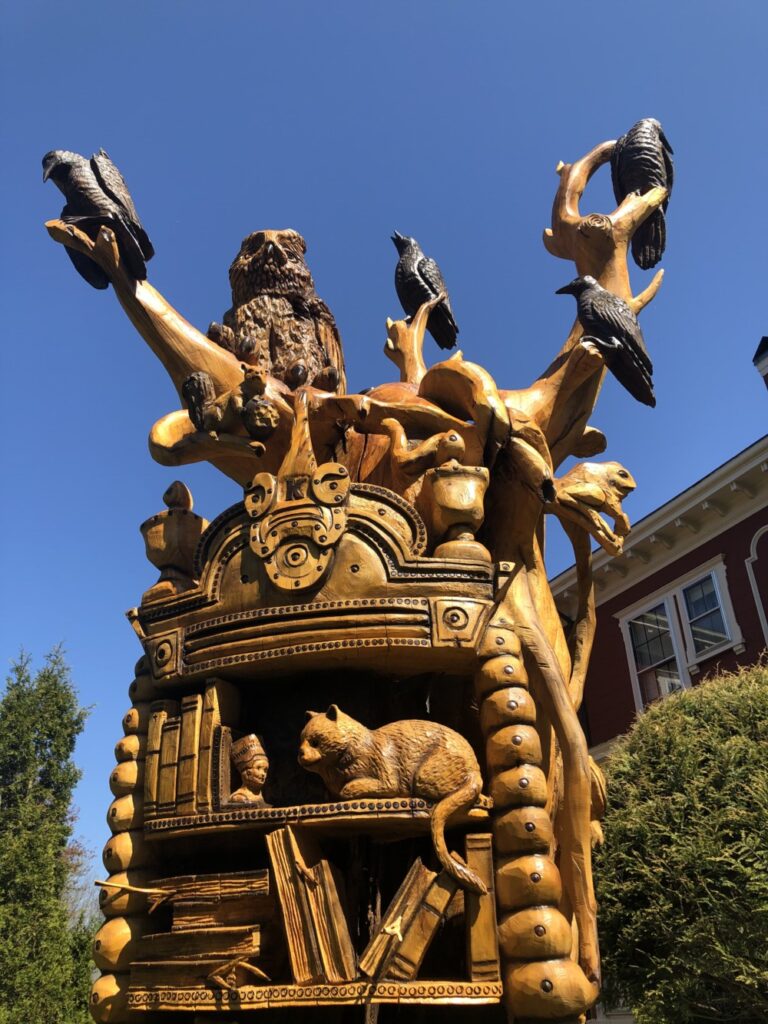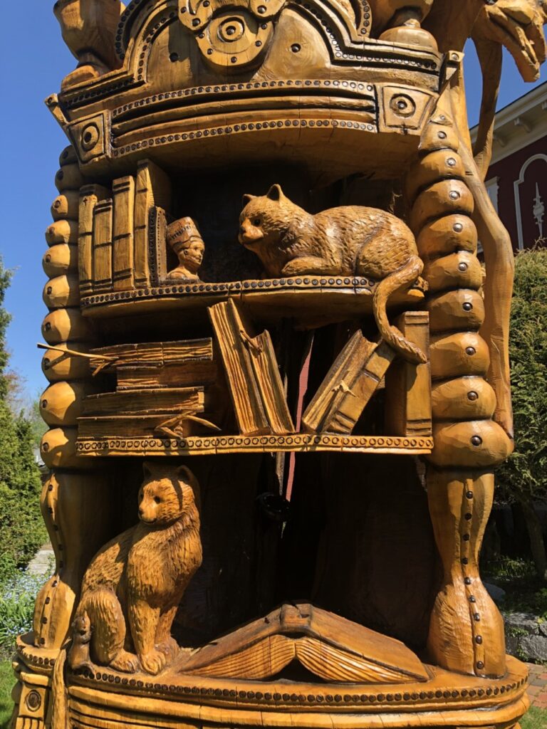 When Tabitha King first approached Landry, her idea was that the tree was morphing into a bookshelf, and that various creatures were hanging out there. As the two discussed ideas, they came up with things that required a lot of detail work, like human feet on the bookshelf legs, to make it look like the bookshelf could get up and walk away. Landry also included tiny beetles, mushrooms and an owl. Tabitha King mentioned that her husband liked dragons and wondered if Landry could put some dragon paws on the tree somewhere. He ended up creating an entire dragon, ripping into the tree. The sculpture also features a tiny mouse grabbing a cat’s legs, twigs as bookmarks in the books, and lots of gnarled, twisted branches.