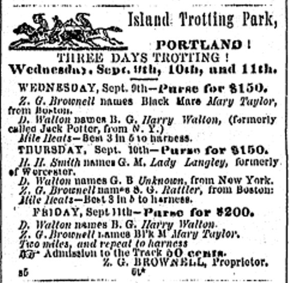 An advertisement for upcoming races at Island Trotting Park, published in the Boston Herald in September of 1857. South Portland Historical Society image