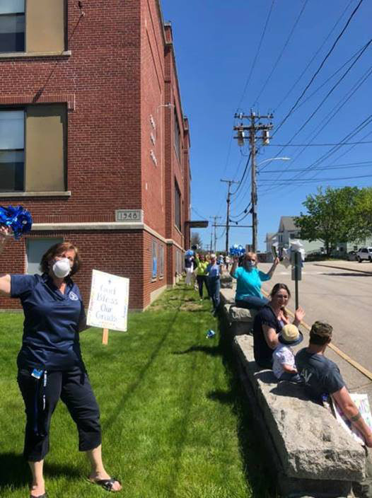 As eighth-grade students were slowly driven by the school, they were greeted by their principal, teachers, ed techs and aides, cafeteria staff, and other St. James employees, who stood 6 feet apart, hoisting signs and waving pom-poms and cowbells to congratulate the students on graduating middle school. Additional commemorations of their achievement are still in the planning stages, including a graduation Mass and ceremony.