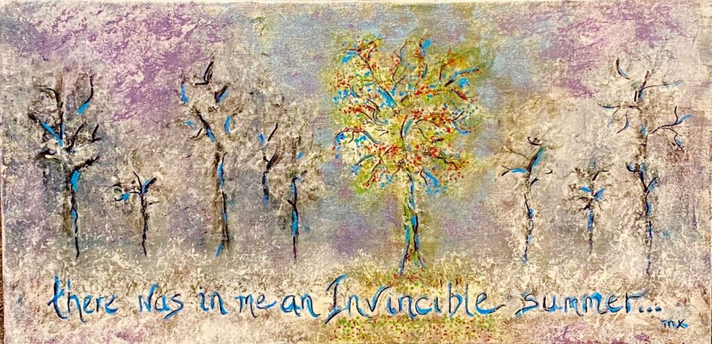 A painting by Karen McDonnell with a quote from Albert Camus that reads, “There was in me an invincible summer.” Courtesy / Karen McDonnell