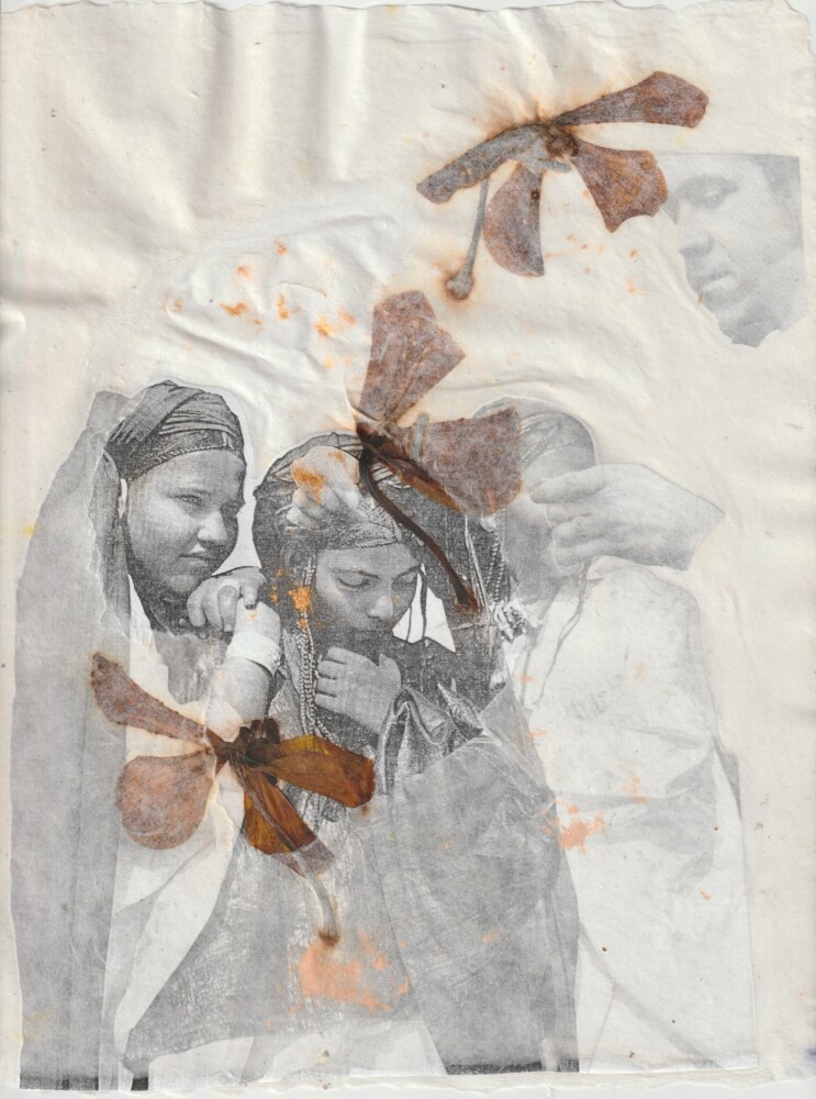 “Daughters of the Dawn,” Ashley Page, 2019, handmade abaca paper, collage, 10.5″ x 8″. Photo by Ashley Page