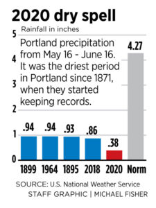 Add to the list of extraordinary events this spring a record lack of rainfall. According to data from the National Weather Service in Gray, the middle of May to the middle of June hasn’t been this dry in the Portland region in the nearly 150 years that such records have been kept.