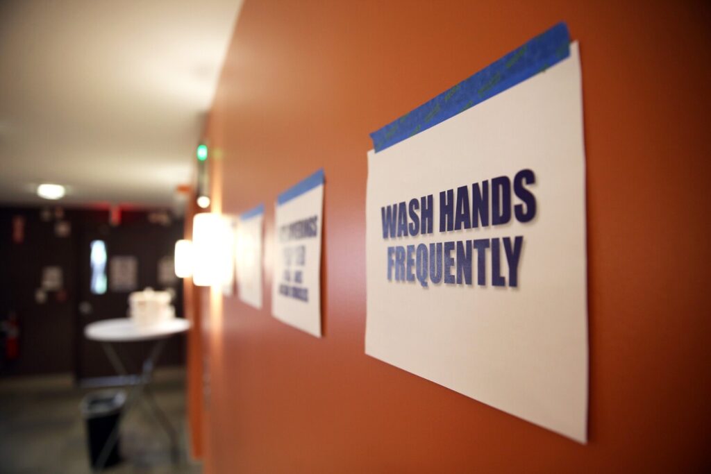 Signage throughout MEMIC’s Old Port office remind employees to practice social distancing, wear masks and sanitize surfaces. Ben McCanna/Staff Photographer