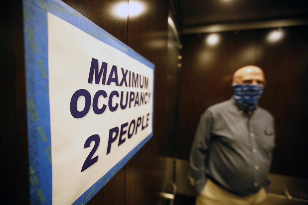 Tony Payne, senior vice president of external affairs at MEMIC, rides an elevator with a maximum capacity of two people during the pandemic. Ben McCanna/Staff Photographer
