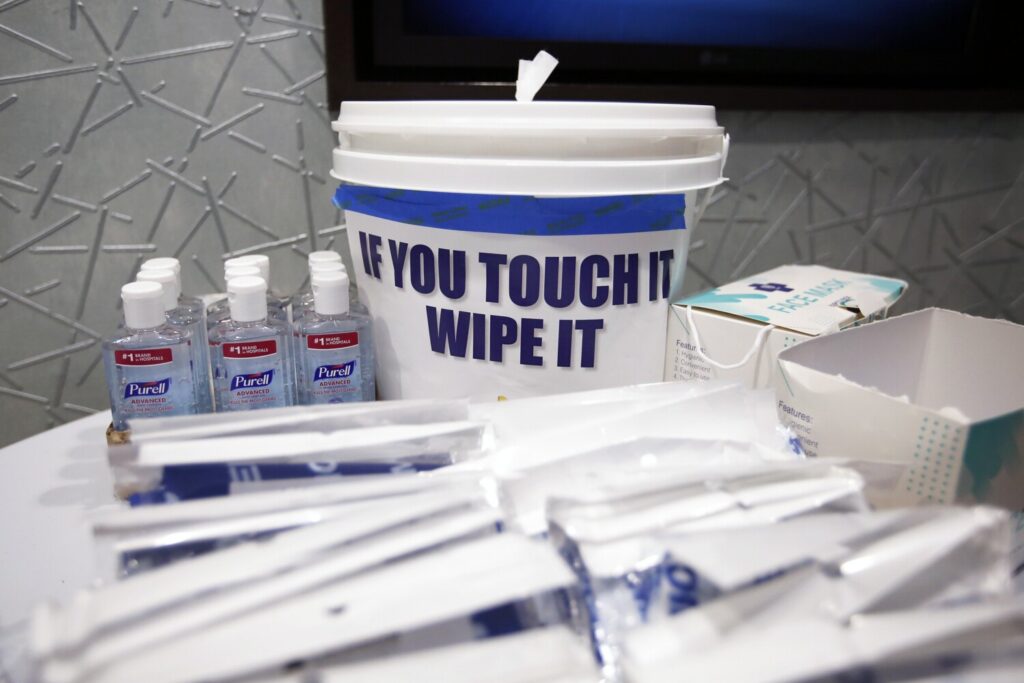 Bond walks through a lobby with a “sanitation station” table covered with masks, neck gaiters, bottles of gel, and hand wipes in a bucket that reads, “If you touch it, wipe it.”