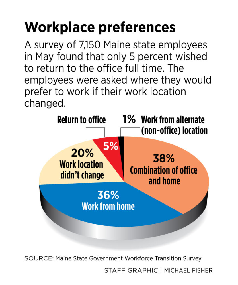 And many workers don’t want to go back to what they left. A recent survey of 7,150 Maine state employees contains a striking sentiment: Only 5 percent of respondents want to return full time to their offices, 36 percent want to keep working from home and 38 percent would like a combination of office and work-from-home.