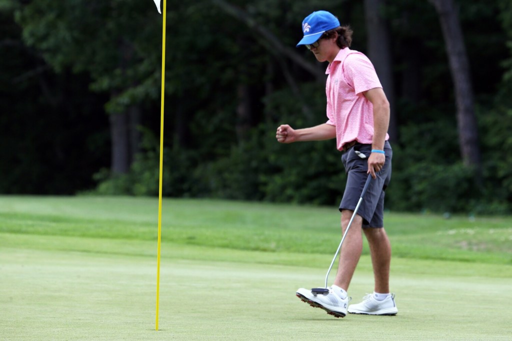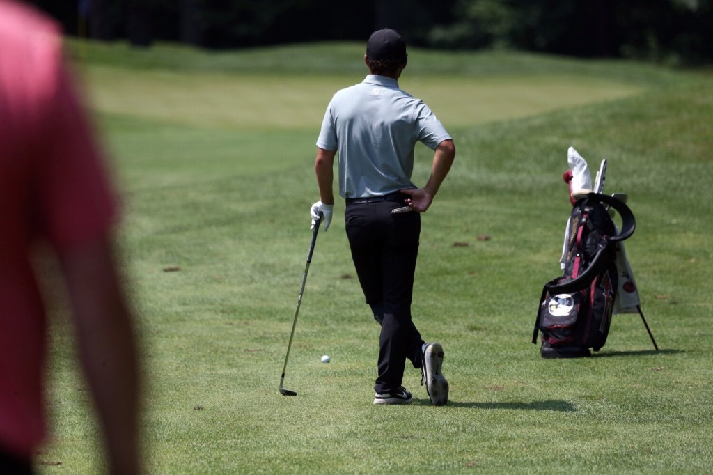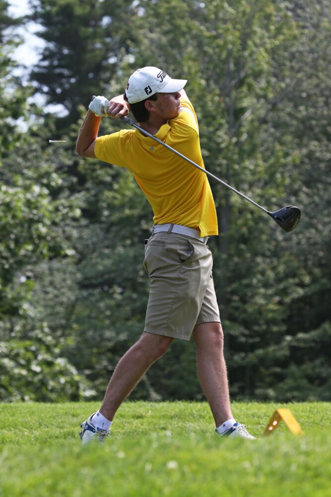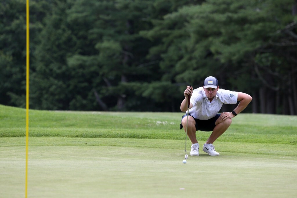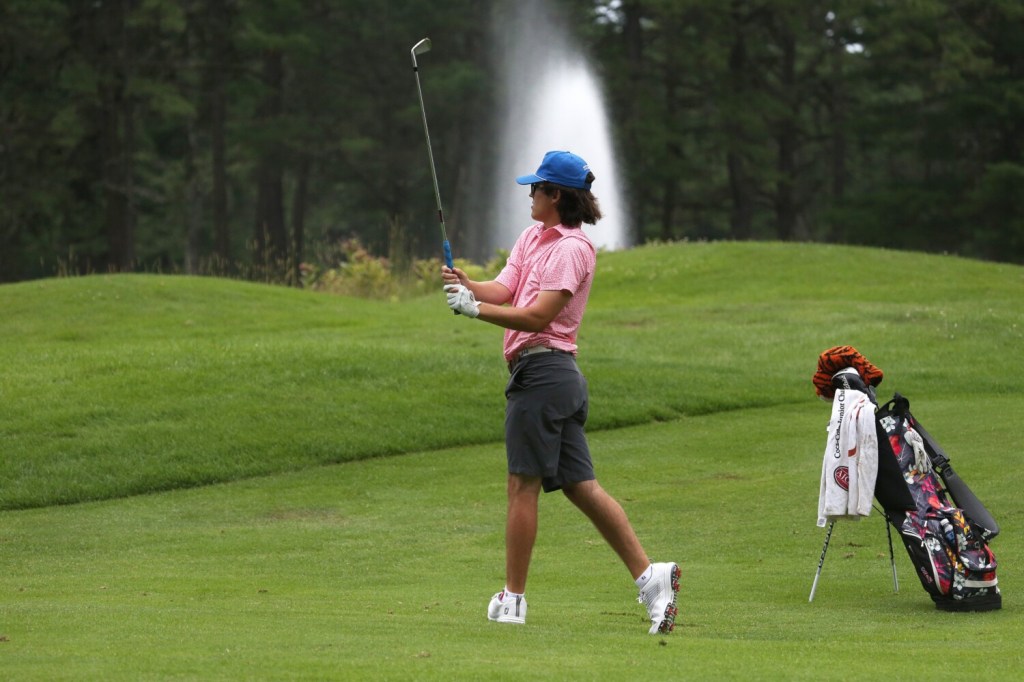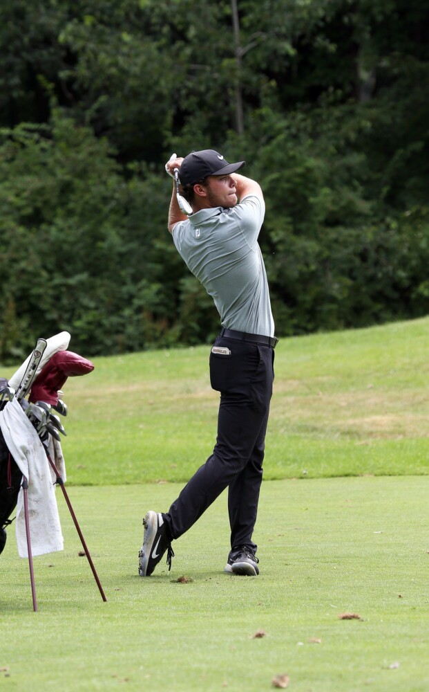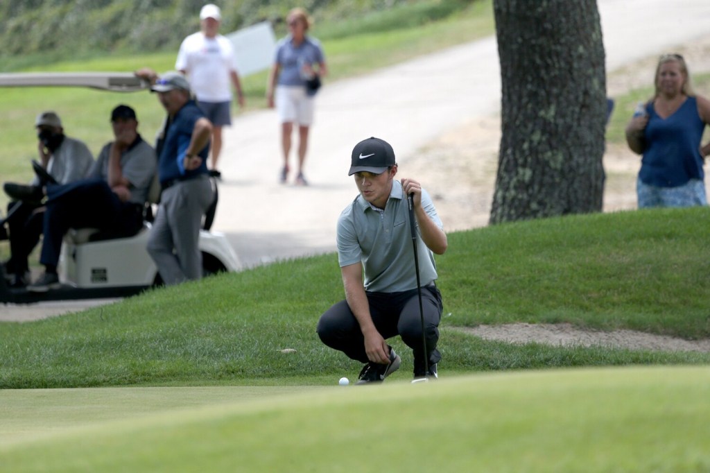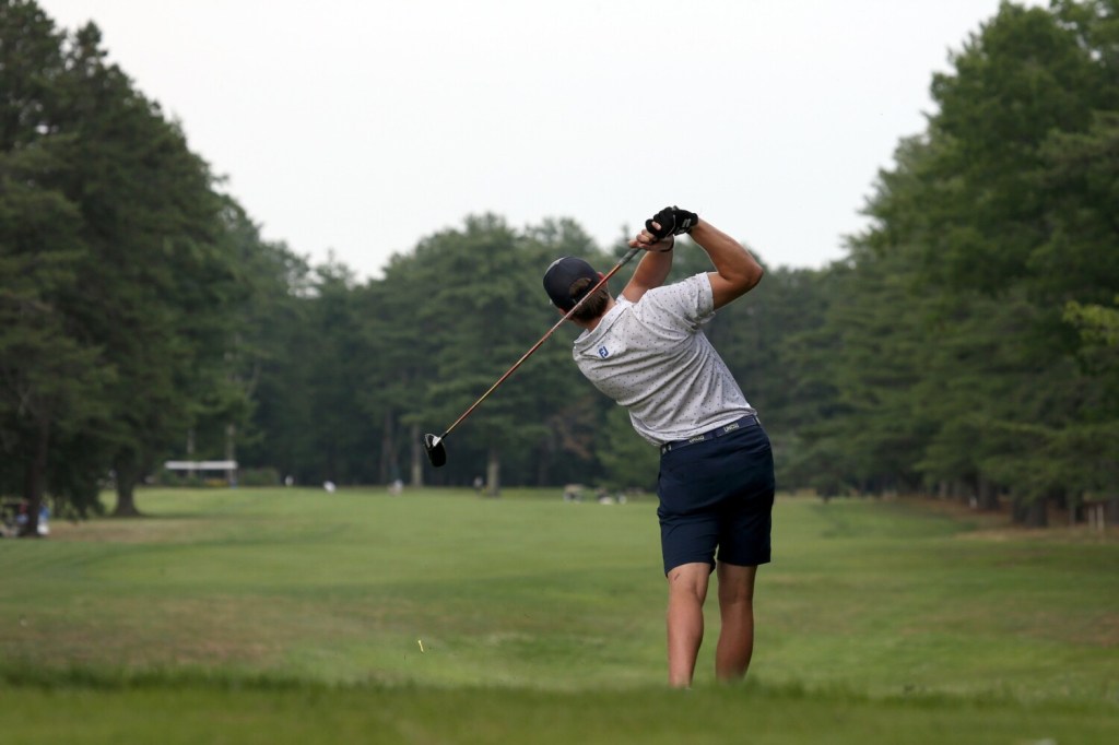 In the afternoon, as skies darkened and thunder rumbled in the distance, playing partners Caleb Manuel, 18, of Topsham (a UConn recruit) and Will Kannegeiser, 23, of Minot (Williams College) both took double-bogey on their final hole, the par-4 ninth. Manuel still finished at 3-under for the day, and Kannegeiser shot a 2-under 69.