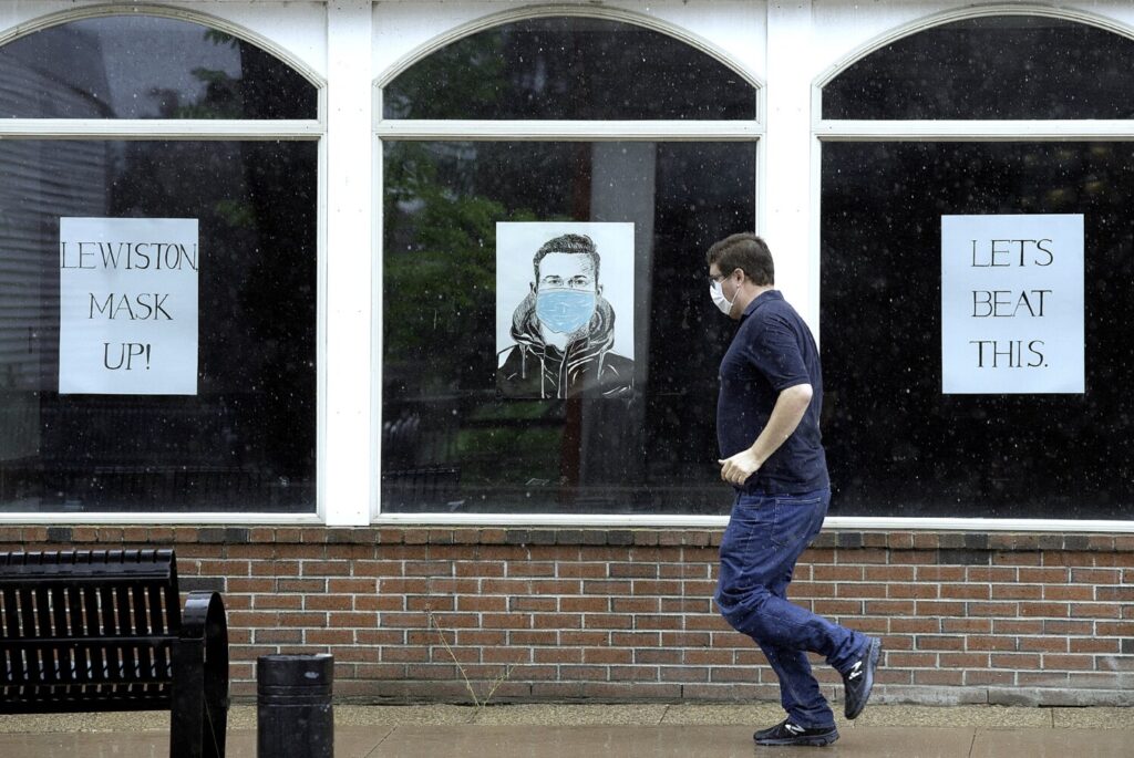A man runs past artwork Monday in Lewiston. A high school student created the artwork to encourage people to wear face masks during the coronavirus pandemic. Daryn Slover photo/Sun Journal Buy this Photo