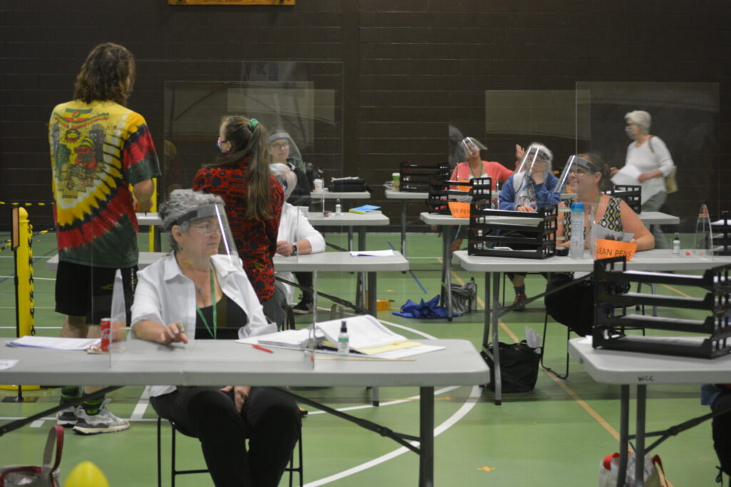 Safety precautions were taken in light of the COVID-19 pandemic. Poll workers wore face shields and were protected by plastic barriers and hand sanitization stations were set up throughout the voting area.