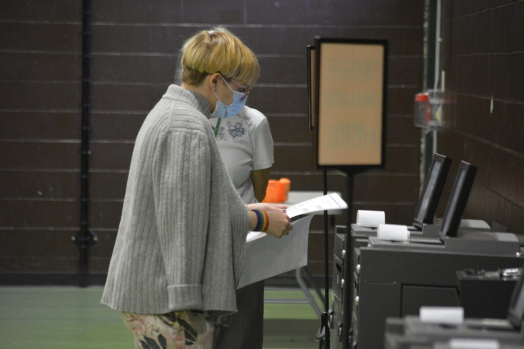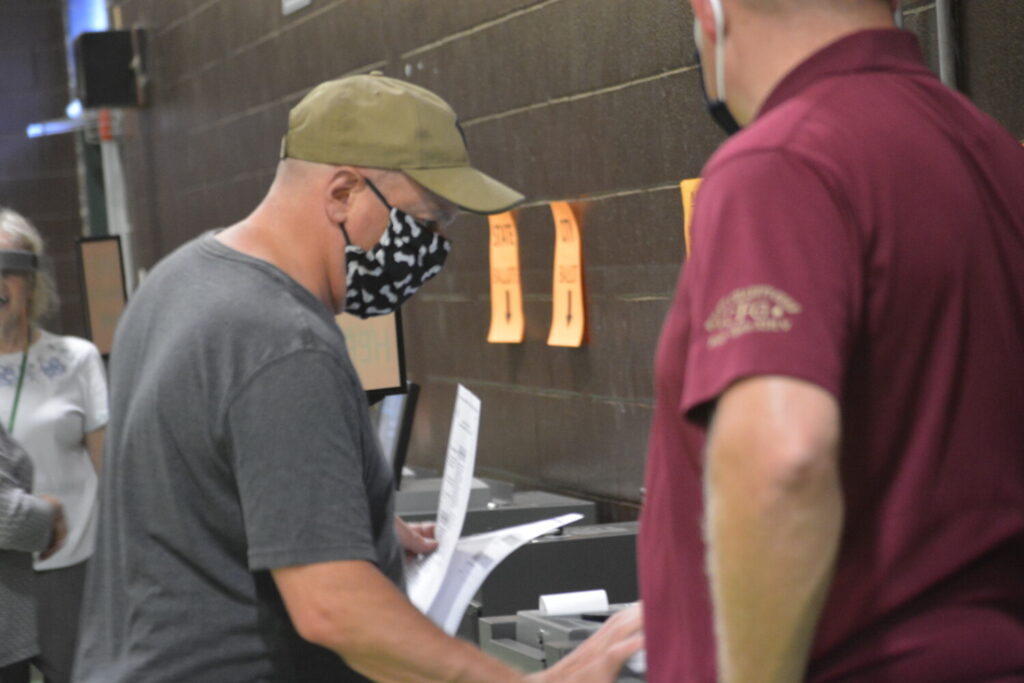 Residents Jacob Murphy, standing at left, and Mikayla Morgan check in with the one of the face-shielded election workers Tuesday. Both voters said they were most concerned with referendum Question 1, approving a bond to pay for infrastructure for high speed internet. “Really, it’s about 5G, and I just feel we’ve become to reliant on technology,” Murphy said. Chance Viles / American Journal