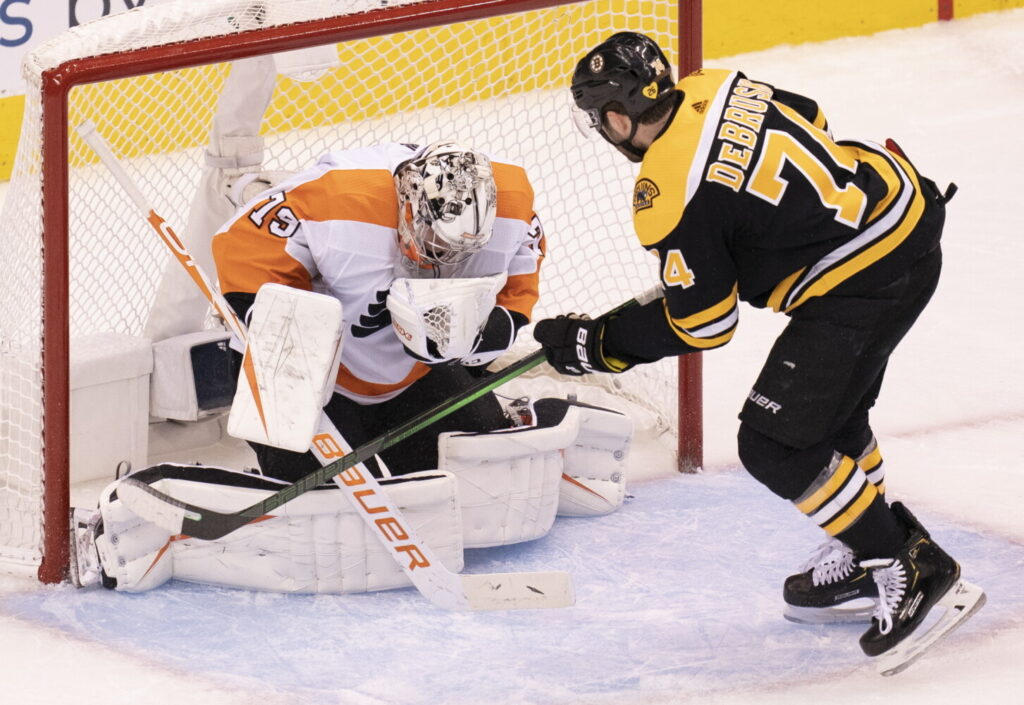 Philadelphia goaltender Carter Hart makes one of his 34 saves, stopping Boston’s Jake DeBrusk during the Flyers’ 4-1 win Sunday in Toronto. Frank Gunn/The Canadian Press via The Associated Press