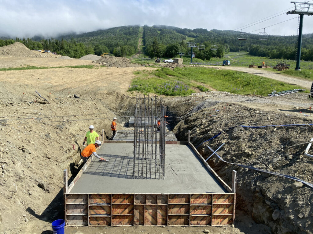 Workers install the new concrete pad for the drive terminal of the new high speed detachable quad at Saddleback Mountain last month. The ski area’s new owners, Arctaris Impact Fund, are investing $18 million in the ski area this year. Photo courtesy of Andy Shepard