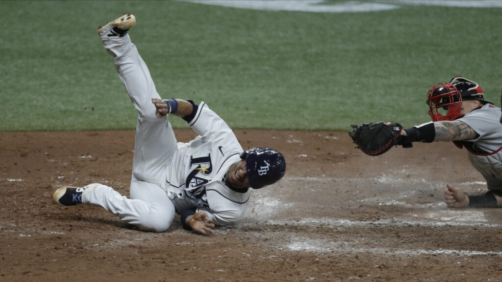 Tampa Bay’s Michael Perez, left, scores ahead of the tag by Red Sox catcher Christian Vazquez on an RBI triple by Austin Meadows during the Rays’ 5-1 win Tuesday in St. Petersburg, Florida. Chris O’Meara/Associated Press