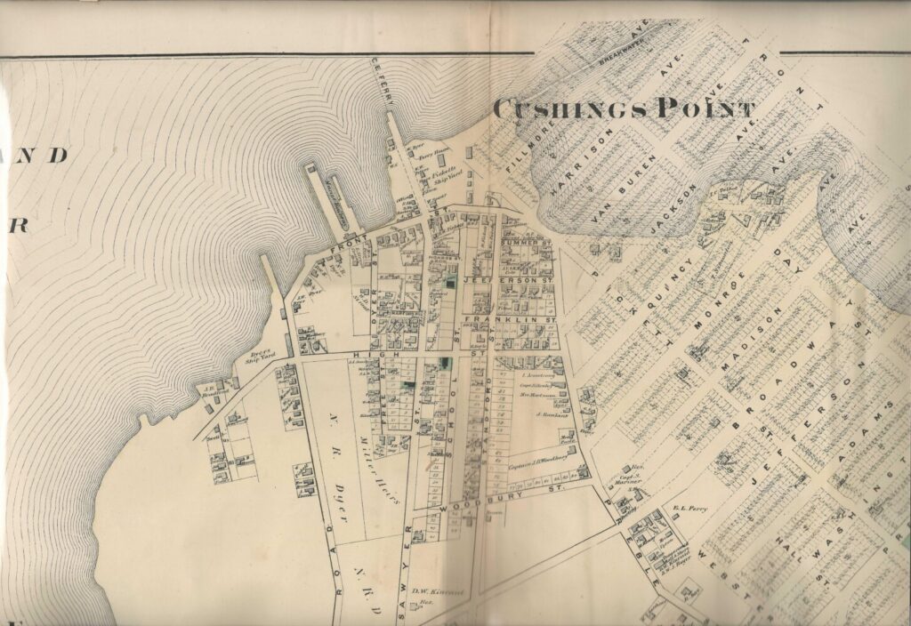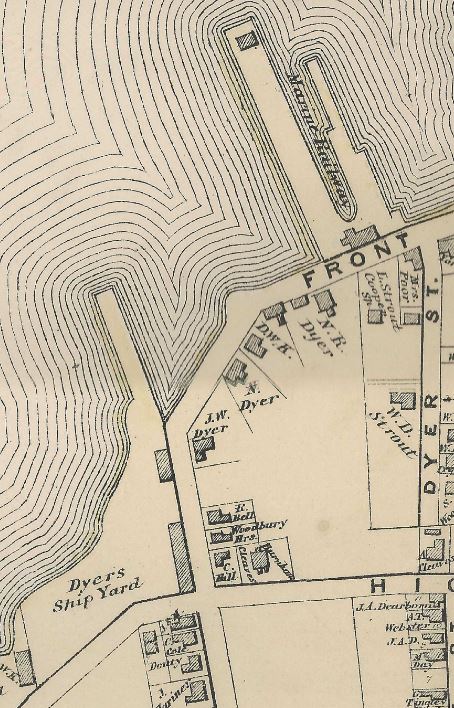 The yard was just to the west of Pine Street, on the water. There was also a line of Dyers descended from Caleb Dyer, which included his son Nathan Dyer, his grandson Nathan Randall Dyer, and even great-grandsons – this line operated the Portland Ship Building Company and the Marine Railway on Front Street – where you’d find the Saltwater Grille and Aspasia Marina today.