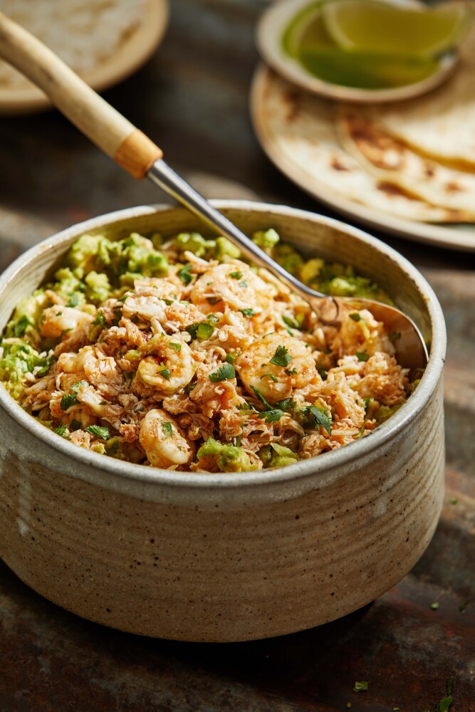 For this dish, first you make a classic chunky guacamole with onion, fresh chiles, salt, cilantro and lime. Then, you toss the seafood with more of those seasonings, as well as a little chipotle chile powder and orange juice.